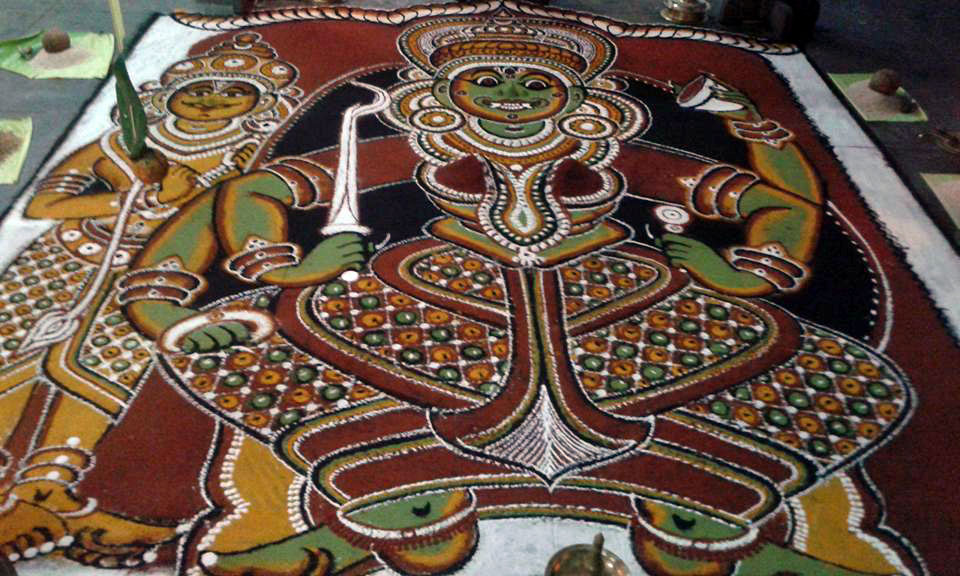(The ritual drawing of kalam is done by Kallat Manikandan & team. The rare figure of the Goddess with 64 hands is a unique ritual drawing usually done only at Vaikom Mahadeva temple once in 12 years.This powdered drawing on the floor will be of 45 x 40 ft and a drawn by a single person(estimated to take more than 24hrs to complete the figure). The ritual connected with this - folk songs, oracle performance etc - are performed on 05th May ).
